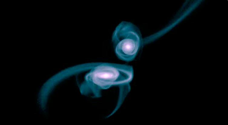 Simulation of two colliding galaxies calculated on a 512-CPU Beowulf cluster, carried out by John Dubinski at the Canadian Institute for Theoretical Astrophysics. The simulation model contained about 300 million objects.